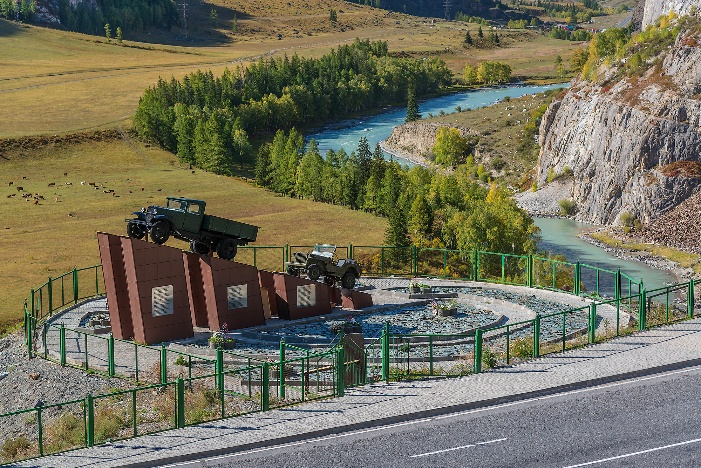 Белый Бом и памятник водителям. На Белом Боме вы увидите памятник водителям Чуйского тракта — символ мужества тех, кто прокладывал эту сложную дорогу. Рядом — фрагмент старинного тракта. С площадки открываются впечатляющие виды на скалистые утёсы.