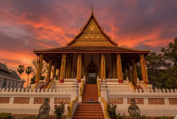 Храм Ват Висун, прозванный благодаря своей форме «Арбузной пагодой». Храм Ват Сиенг Тхонг, чьи крыши, изгибаясь, простираются вниз почти до самой земли.