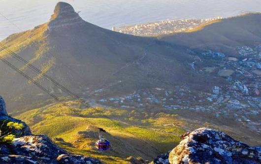 На вершину можно подняться на фуникулере, где открывается потрясающий вид на Атлантику, горную гряду Двенадцать Апостолов, Львиную Голову, город и остров Роббен, где был заключен Нельсон Мандела.